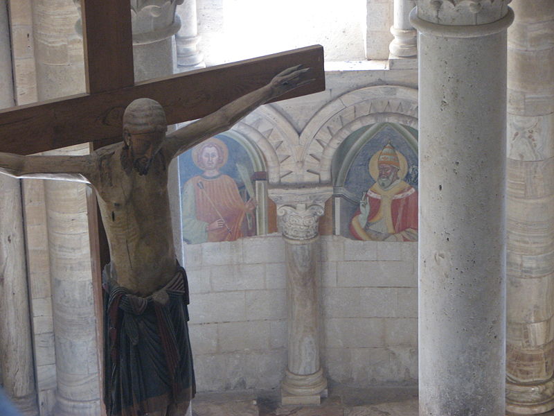 Alcune sculture, la porta nord e quella sud, gli stipiti della sagrestia, alcuni capitelli collocati nella tribuna nord, altri capitelli, frammenti di decorazioni o pilastrini, fanno pensare all'esistenza di un edificio antecedente al XII secolo, quando iniziò la costruzione della nuova abbazia. Intorno al 1000 sarebbe stata edificata una chiesa, di cui rimane solo il campanile, costruito iniziamente staccato dalla navata, secondo la tradizione medievale.