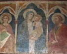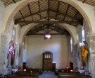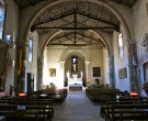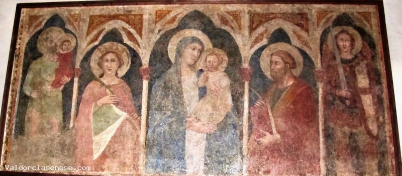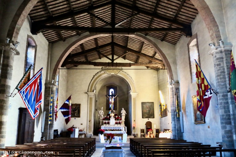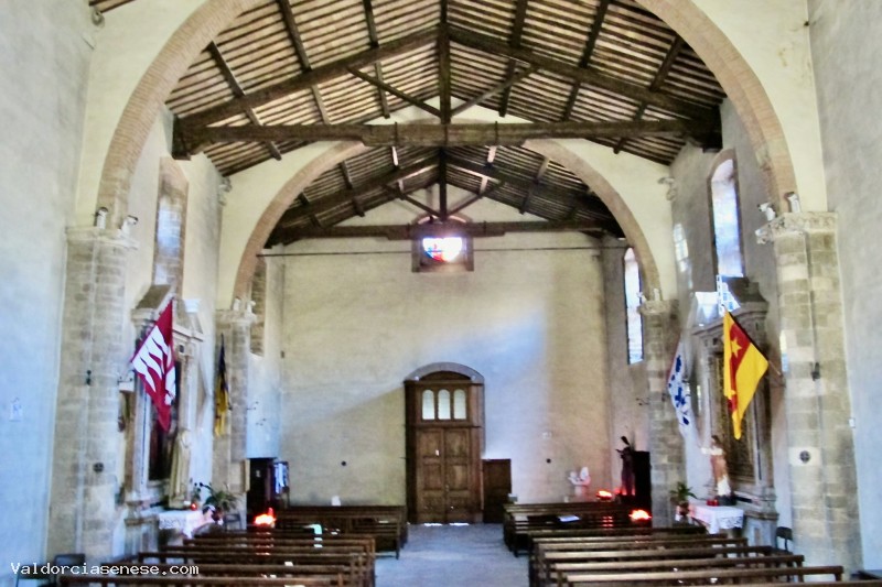 All'interno costituito da una sola navata ci sono pilastri in pietra addossati alle pareti,che sorreggono grandi archi alternati su cui poggiano le travi del tetto. Sull'altare maggiore c'è un elegante tabernacolo in legno intagliato, dorato e dipinto con Cristo risorto e Santi, realizzato da Alessandro Casolani. Sulla parete destra del presbiterio, un affresco staccato della Madonna col Bambino e Santi (fine XIV secolo).