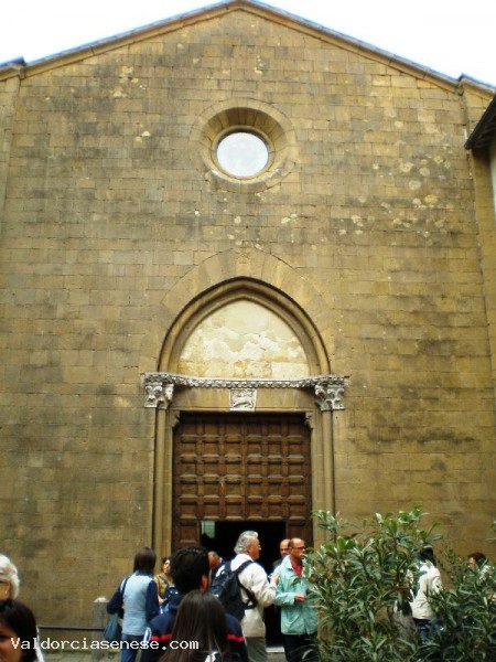 E’ uno degli edifici francescani più antichi d'Italia ed è l’unico monumento di rilievo rimasto dell’antico borgo di Corsignano. La chiesa, risale alla fine del XIII secolo, presenta una semplice facciata a capanna e ha una sola porta sormontata da un oculo. L’interno è ad una sola navata e, come nella tradizione delle chiese dell'Ordine francescano, è coperta a cavalletti. Nelle pareti del coro è narrata la leggenda francescana; questi affreschi sono stati attribuiti da alcuni studiosi al senese Cristofano di Bindoccio, detto Malabarba, di cui si hanno notizie tra il 1361 e il 1401. Il bel crocefisso su tavola dipinto è attribuito ad un maestro affine a Segna di Buonaventura, allievo di Duccio. Sull’altare di sinistra vi è una tavola di Luca Signorelli, Madonna della Misericordia e i Ss. Sebastiano e Bernardino.