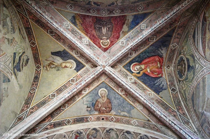 E’ uno degli edifici francescani più antichi d'Italia ed è l’unico monumento di rilievo rimasto dell’antico borgo di Corsignano. La chiesa, risale alla fine del XIII secolo, presenta una semplice facciata a capanna e ha una sola porta sormontata da un oculo. L’interno è ad una sola navata e, come nella tradizione delle chiese dell'Ordine francescano, è coperta a cavalletti. Nelle pareti del coro è narrata la leggenda francescana; questi affreschi sono stati attribuiti da alcuni studiosi al senese Cristofano di Bindoccio, detto Malabarba, di cui si hanno notizie tra il 1361 e il 1401. Il bel crocefisso su tavola dipinto è attribuito ad un maestro affine a Segna di Buonaventura, allievo di Duccio. Sull’altare di sinistra vi è una tavola di Luca Signorelli, Madonna della Misericordia e i Ss. Sebastiano e Bernardino.