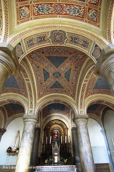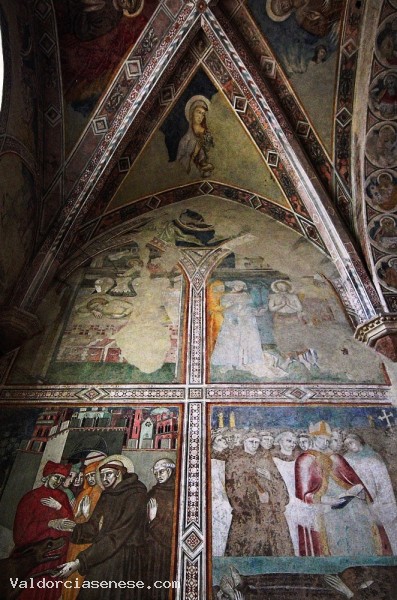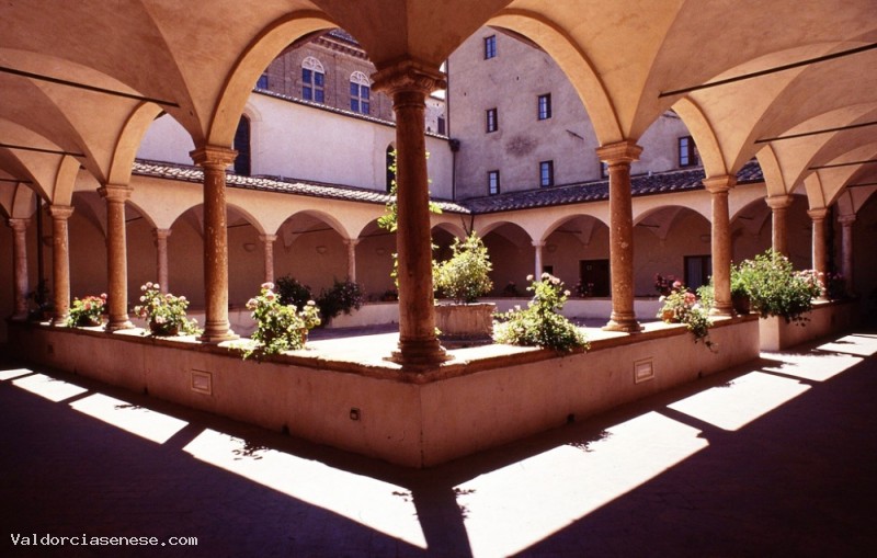 It’s one of the most ancient Franciscan buildings in Italy and it’s the only outstanding building, that has survived in the ancient village of Corsignano. The church dates back to the end of the XIIIth century. It presents a simple facade with only one portal surmounted by a circular window. The interior is at one nave and it’s covered with trusses. On the walls of the choir, the Franciscan legend is narrated. These frescoes have been attributed by some scholars to the Sienese Cristofano di Bindoccio, nicknamed Malabarba, known between 1361 and 1401. The beautiful crucifix , painted on a panel, is attributed to a master painter, similar to Segna di Buonaventura, one of Duccio’s pupils. On the altar on the left, there’s a panel by Luca Signorelli, titled Madonna of Mercy with Saint Sebastian and Saint Bernardino. Following the most recent restoration, in 2002, the church has been enriched by four art works executed by the Sienese sculptor, Massimo Lippi.