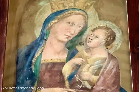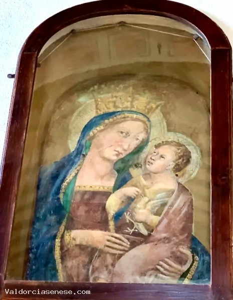 This Virgin and Child belongs to the iconographic category of representations known as "with the goldfinch": Jesus holds a curious little bird in his left hand, which he mistreats according to a symbolism alluding to the Passion of Christ, as can also be found elsewhere, particularly in Montalcino. The Virgin's right hand, which she holds out to her son, also bears strong similarities to the one housed in the local museum.