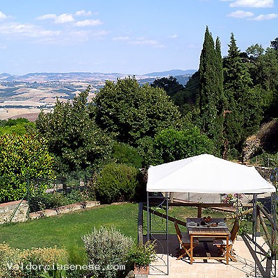 This residence is situated in the back part of an old palace, one of the most important buildings in Montalcino of its time. Our house was in the stores. Originally, the building functioned as a mill for the town. It was then turned into a brick factory, topped with a towering chimney of which only the base remains today.From the garden, you can see the tower of the Piazza del Popolo in Montalcino as well as the Val d’Orcia as far as the eye can see. There is the sensation of being in the town while being immersed in the Tuscan countryside at the same time. It was here that we had the idea to restore the building and to make our home and the Porta Castellana B&B.
