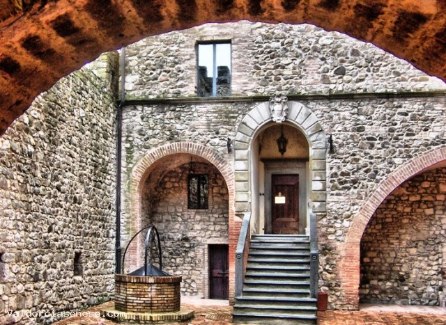 Il castello di Poggio alle Muraè un grande castello a pianta quadrangolare formato da più corpi articolati intorno ad un cortile porticato con un’alta torre e mura di cinta merlate.
