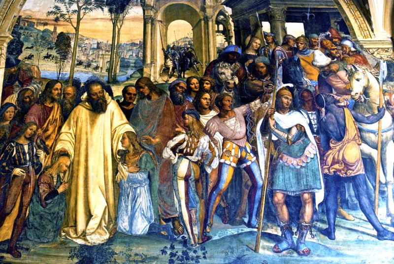 The remarkable monumentality of the main group of Benedict and one of the riders and the armed men among them a magnificent horse in the background monuments of Rome and the portrait of Signorelli and other painters of his contemporaries.