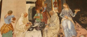 In the scene we see two monks intent to consume a pastoall'interno of an inn and in the background, Benedict scolds them for violating the Rule. This is probably the most successful of the pictorial scene. Inside the inn, you will see two comely maids, serving the two monks, visibly pleased with their illegal dinner. A boy advance careful not to spill the contents of a container filled with soup. Two other women in the background are busy in their chores, like a true Italian cuisine era. Against the door ajar you can see a young shoulders portrait in backlight, typically feature signorelliana.