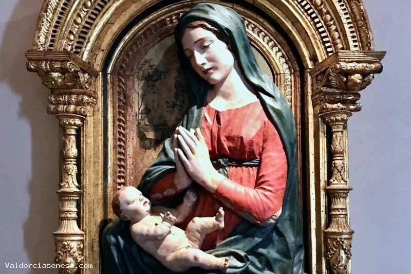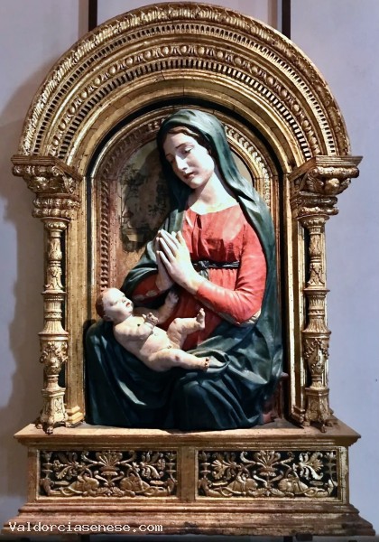 The combination of the finely carved frame, the painted background behind the bas-relief, and the highly refined Madonna and Child have resulted in an original and highly beautiful work of art.