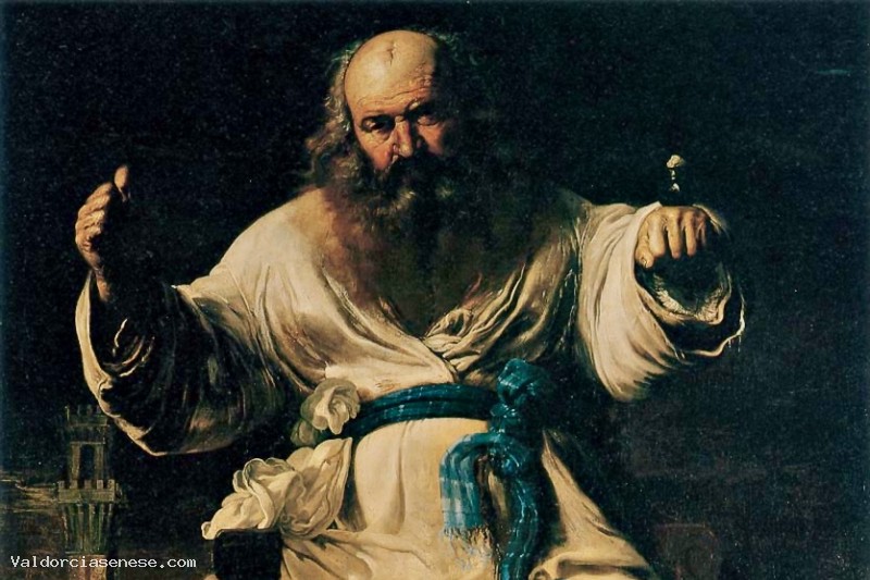 Purchased by the Monte dei Paschi di Siena in 1984, the painting originally belonged to the collection of Florence Gerini: lower left, above the sheet that protrudes from the stage on which sits the charlatan, appear the sign ("In Siena Bernardino Mei Painter ") and the probable date of execution of the canvas (you can imagine will be the year" 1656 "). The unusual iconography and the originality of the subject provide the modern viewer a true slice of customs, traditions and beliefs that were to characterize the social context of Siena - Siena and not only - in the middle of the seventeenth century. The old charlatan sits on a wooden stage surrounded by the "tools" of their trade, bottles and glass jars containing healing potions from unlikely. The view from the bottom seems to accentuate the grandeur of the ambiguous character whose body mass is amplified by overlapping and continuous dall'ingolfarsi countless layers of clothes. The performance of the mysterious healing takes place within the walls of the city of Siena, as the profile of the Mangia tower that is visible at the bottom, on the left of the picture. The thick beard new philosopher, look sharp, piercing and the peremptory gestures arouse fearful amazement of the crowd that gathers cautious at the foot of the stage, not everyone seems to still suffer the dark influence of the arcane character: among the onlookers stunned fits even the skeptic who, staring at the old bearded, suspicious sniffs the contents of a small vial. The adoption of a treatment luministic strongly opposed, characterized by the juxtaposition of large areas of deep shadows and bright with wrap-around help to accentuate the suspended atmosphere and disturbing that circulates inside painting, on which rests the dark mass of stormy sky.