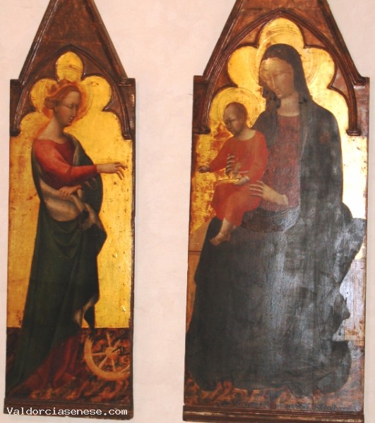 Due pannelli cuspidali facenti parte di un grande polittico smembrato e raffiguranti, rispettivamene di santa Caterina d'Alessandria nel pannello più piccolo e la Madonna in trono col Bambino, nell'altro.