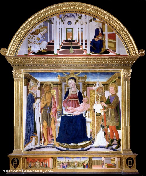 The monumental altarpiece is crowned at the top by the lunette with the Annunciation while at the bottom, in the lower part of the work, there is a tripartite predella depicting the Martyrdom of San Biagio, the Crucifixion, the Saint Nicholas doing charity. The work was painted by Vecchietta shortly after 1460 for the nearby church of Spedaletto, a fortified farm belonging to the properties of the Spedale S. Maria della Scala of Siena. The large typically Renaissance square table shows the figures placed in a well-studied perspective dimension, enhanced by a delicate color scheme and a shining light.