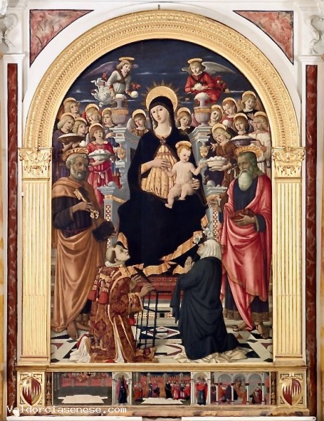 On the high altar of the church of the same name, there is the large Madonna delle Nevi, a masterpiece signed and dated by Matteo di Giovanni: 1477. It shows the Madonna enthroned with the Child flanked by Saints Peter and John the Evangelist and in front of Saints Lawrence and Catherine of Siena.