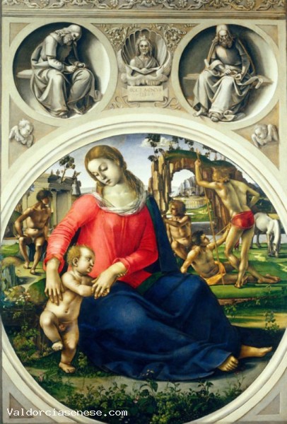 Secondo Giorgio Vasari quest'opera, insieme alla famosa Educazione di Pan, purtroppo distrutta a Berlino nell'ultima guerra mondiale, venne dipinta per Lorenzo il Magnifico. Lo strano impianto iconografico mostra le due principali figure divine in un paesaggio popolato di figure virili nude che probabilmente rimandano all'umanità ante legem, così come accadrà più tardi nel Tondo Doni di Michelangelo. Olio su tavola, cm. 170 x 117,5
