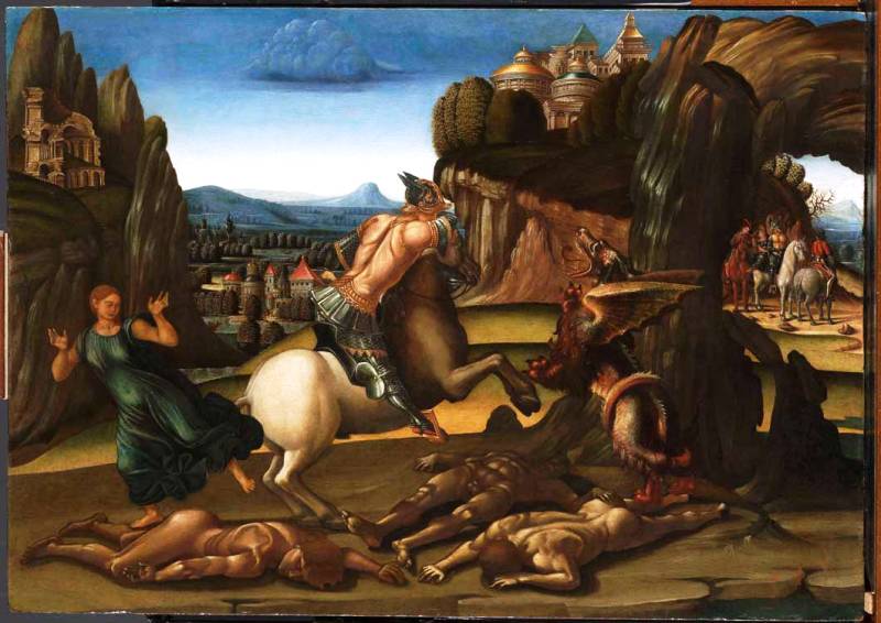 Considerata a lungo un'opera di collaborazione, è oggi ritenuta un'opera autografa realizzata senza l'aiuto della bottega e datata tra il 1494 e il 1502. Il primo piano è occupato da San Giorgio sul cavallo che sta per assestare il colpo mortale al drago, carnefice dei corpi senza vita che giacciono a terra. La principessa si getta verso sinistra bilanciando lo spostamento verso destra del cavallo, mentre sullo sfondo, a destra, San Giorgio vincitore riporta al padre la principessa. La desolazione del paesaggio in primo piano ben si addice ad una scena di morte con i corpi riversi a terra fortemente risentiti nella muscolatura. Le dimensioni (cm 55 x 77) della tavola e il suo sviluppo orizzontale sono insoliti e fanno pensare ad un utilizzo dell'opera che oggi ci sfugge.