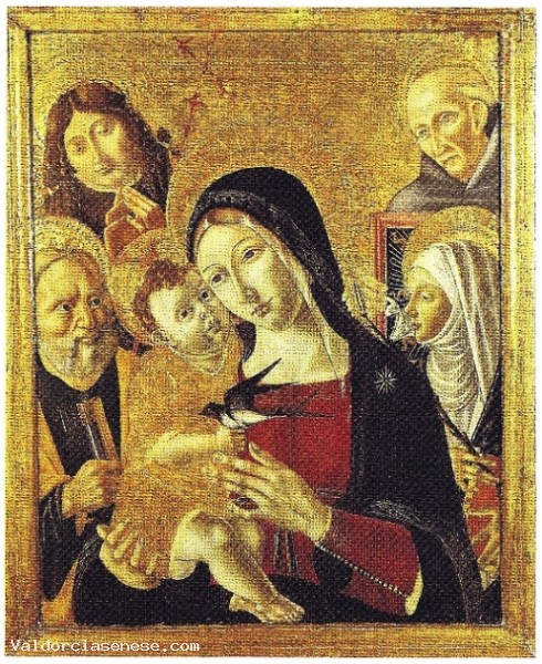 al centro del dipinto presenta la Vergine che sostiene il Bambino che a sua volta tiene in mano una rondine ad ali aperte. Tutto intorno i Santi: San Giovanni, san Pietro, San Bernardino e Santa Caterina da Siena.