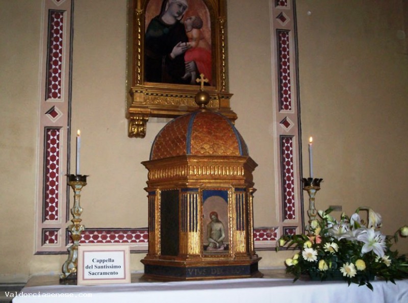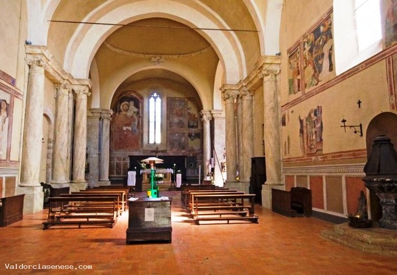 It was built in the second half of the XIIIth century ( on the bell the year 1292 is engraved) according to Romanesque-Gothic architectural canons, that is with a Romanesque cross plan (the classical T shape with a single nave). Inside, lies hidden a small museum made up of various XIVth and XVth century Sienese frescoes, among which one is quite remarkable ,to the point that the church is worth visiting even if only to view such artwork: it’s the colossal figure of Saint Christopher by Niccolò di Segna (XIV). Furthermore, inside the church, there was a Madonna with Child by Lorenzetti. Only the copy is now visible, since the original is housed in the Museum Diocesano in Pienza. Aside from the above mentioned fresco, by Segna, the church also hosts the following artworks: Left hand side of entrance : Saint John Evangelist and Saint Bartholomeus by a Sienese painter(XIII) Left hand side of nave: Saint Nicholas and Saint Cosma and Damien (XIV) Left hand side of nave: Madonna with Child by Sienese painter (XIV) Left hand side of nave: Madonna with Child by Niccolò di Segna (XIII) Left transept: Saint Christopher – Wooden Sculpture (XV) Left transept: Wooden Crucifix (XIII) Left hand side of Apse : The Confession ( Lorenzetti School XIII) Apse : Saint Christopher by Niccolò di Segna (XIII) Apse: Saint Leonard by Niccolò di Segna (XIII) Apse: Tabernacle – Grating by Pietro Betti (1313) Apse: Crucifix Right hand side of nave: Oath of the Vicar by a Sienese painter (XIII) Right hand side of nave: Life of Saint Catherine of Alexandria by Niccolò di Segna (XIII) Right hand side of nave: Madonna with Child and Saints (XV) Right hand side of nave: Saint Peter by Niccolò di Segna (XIII) Right hand side of nave: Holy Water Basin (XIV) Left hand side of nave: Bell (1292) Right hand side of entrance: Blessed Gherardo from Villamagna by a Sienese painter (XIII)