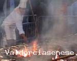 In una gratella gigante di 14 metri vengono cucinate le bistecche alla fiorentina, rigorosamente di carne di razza chianina, cotte al sangue, come vuole l'antica tradizione toscana.