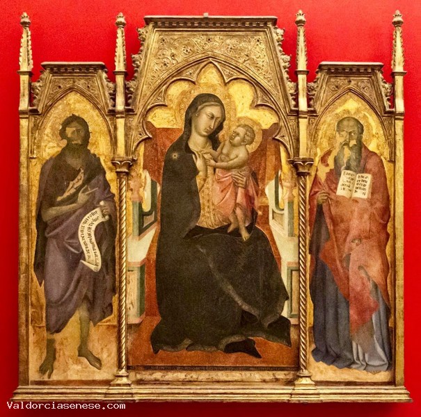 Al centro è raffigurata la Madonna, seduta su un trono marmoreo, coperto da un drappo rosso ornato d’oro. Anche il bordo del manto blu e la veste rossa della Madonna sono impreziosite da ornamenti in oro. Il bambino in piedi sulle ginocchia della madre volge il suo sguardo verso gli occhi di lei nell’atteggiamento caratteristico delle madonne senesi mentre posa una mano sul bordo dello scollo. Lungo il bordo inferiore dello scomparto centrale corre una scritta incompleta: DNA [LI]NA FILIA OLI[M] PETRI CE[IA]TI JAKOB OLI[M] D[OMINI] GRIFFI FECIT FIERI I[N] CAPEELLA PER ANIMA SUA che si può interpretare come: DONNA LINA FIGLIA DEL FU PIETRO CACCIATI E GIACOMO FIGLIO DEL FU SER GRIFFI FECE FARE QUESTA TAVOLA NELLA CAPPELLA PER LA (SALVEZZA) DELL’ANIMA SUA. Questa opera proviene dalla Chiesa di S. Francesco a Montalcino dove fu conservata fino al 1628. Nel 1910 venne in possesso della famiglia Angeli di Lucignano. Nel 1923 venne donata al Museo di Lucignano da Carlo Angeli, primo curatore del Museo. Il trittico era stato restaurato con l’integrazione delle parti lacunose, ma è stato in seguito riportato allo stato primitivo restituendo il colore all’intensità originaria.