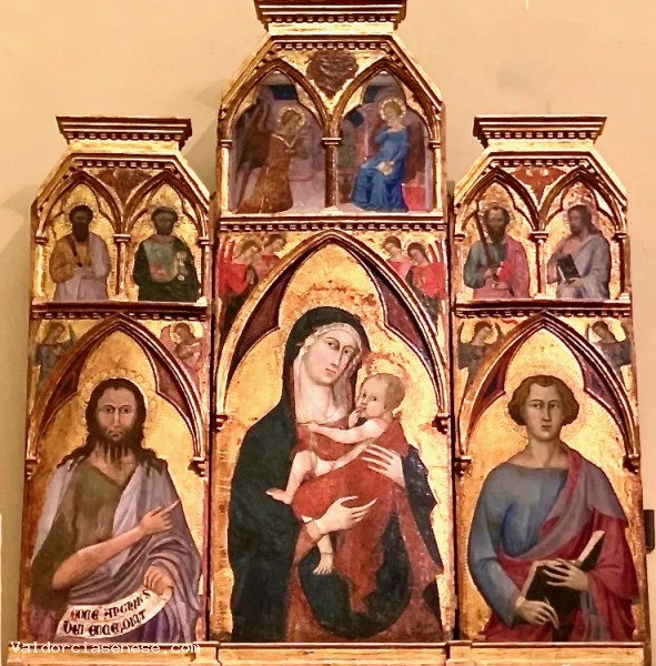 Pala a trittico mancante delle decorazioni della cornice, immagini incorniciate da finestra ogivale triloba con angeli affacciati ai lati. Madonna con Bambino, san Giovanni Battista, san Giovanni Evangelista, angeli e santi, storie della vita della Madonna