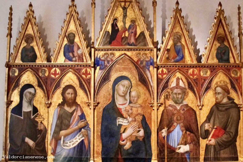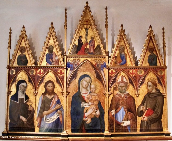 Si presenta distinta in due fasce: in quella inferiore, di maggiori proporzioni, troviamo al centro la Vergine con in braccio il Bambino. Ai suoi lati scopriamo, a sinistra, santa Chiara e san Giovanni Battista mentre, a destra, ci sono le immagini di sant'Agostino e san Francesco d'Assisi. nella fascia superiore, composta da cuspidi, si scopre nella scena centrale la scena del Cristo crocifisso con ai piedi della croce le figure della Madonna, di san Giovanni Evangelista e della santa Maria Maddalena. Nelle altre cuspidi della cimasa sono stati raffigurati quattro santi di difficile interpretazione. Agostino vi è dipinto come vescovo e Dottore della Chiesa: in testa porta la mitra, indossa il piviale e con la mano destra impugna il bastone pastorale. Con la mano sinistra porta al petto un libro rosso chiuso. Il suo viso, abbellito da una folta barba riccioluta, ha un aspetto stereotipato, tipico della pittura del secolo.