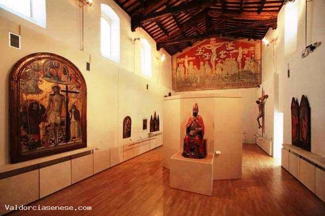 Di epoca rinascimentale sono presenti una Madonna della Misericordia di Vincenzo Tamagni e una Madonna col Bambino e Santi del più bravo allievo del Beccafumi, Marco Pino. Il nucleo di scultura lignea dipinta rappresenta uno dei pezzi più importanti per il Museo di Montalcino. I modi forti ed espressivi di Giovanni Pisano si riflettono in una straordinaria Madonna , mentre un piccolo crocifisso dai tratti sottili ed eleganti realizzato da Giovanni d'Agostino, capomastro del Duomo di Siena, è la trasposizione della pittura di Simone Martini in scultura.