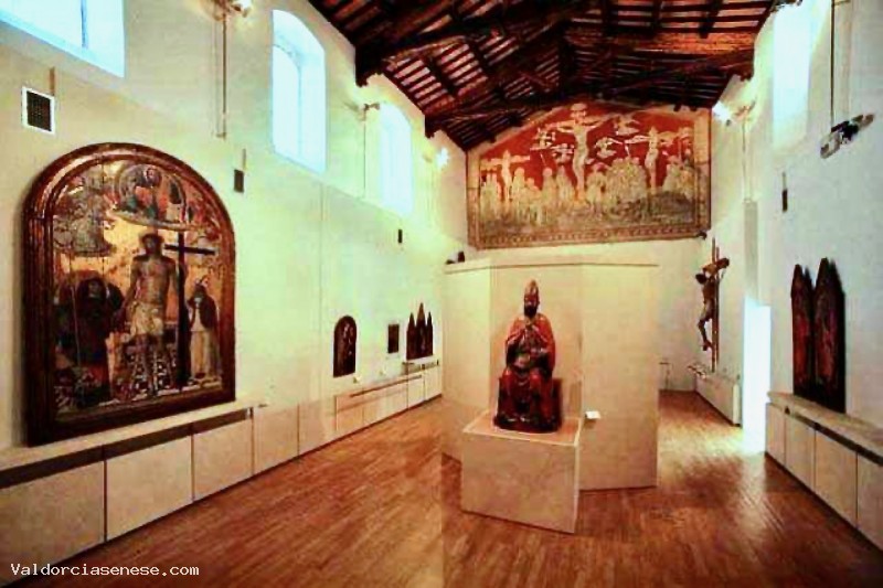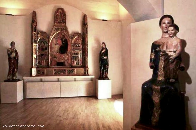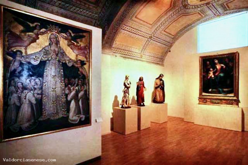 Di epoca rinascimentale sono presenti una Madonna della Misericordia di Vincenzo Tamagni e una Madonna col Bambino e Santi del più bravo allievo del Beccafumi, Marco Pino. Il nucleo di scultura lignea dipinta rappresenta uno dei pezzi più importanti per il Museo di Montalcino. I modi forti ed espressivi di Giovanni Pisano si riflettono in una straordinaria Madonna , mentre un piccolo crocifisso dai tratti sottili ed eleganti realizzato da Giovanni d'Agostino, capomastro del Duomo di Siena, è la trasposizione della pittura di Simone Martini in scultura.