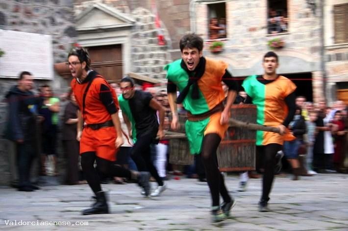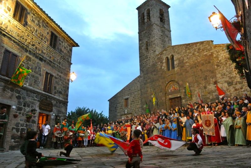 Ricollegandosi proprio a questa Festa, alcuni anni or sono fu riproposta la corsa di un palio, inizialmente delle quattro contrade riferite ai borghi originari di Radicofani. Così, ogni anno, ai settembre, dopo la presentazione del palio del sabato, si cominciano le celebrazioni con la messa, il magnifico corteo con più di cento figuranti, le sfide all’arco storico, le bandiere, i tamburi e gli squilli delle chiarine partono i portatori dei barellini con i “bigonzi” dell'uva e correndo per le tortuose vie del borgo cercano di raggiungere la piazza San Pietro dove, di fronte l’antica pieve viene proclamato il vincitore. Il Palio è previsto intorno alle 19 della domenica, mentre il sabato pomeriggio parte un ricco programma di spettacoli, di degustazioni e cene nelle contrade.