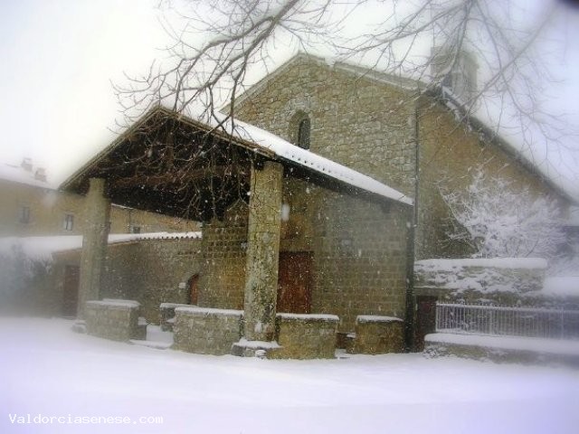 La controfacciata interna è riempita da affreschi con Storie della vita di San Bernardino, opera di un artista senese della fine del XIV secolo, Dello stesso artista c'è un affresco della Madonna col Bambino sulla parete sinistra. Inoltre, dietro il coro ligneo realizzato nel 1730, si trova un altro affresco della seconda metà del trecento, raffigurante la Strage degli Innocenti.