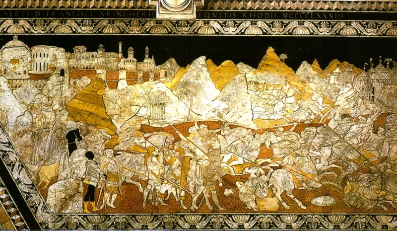 La storia di Iefte è narrata nel Libro dei Giudici (11, 29-40) ed è qui incorniciata da un elegante fregio di delfini affrontati, conchiglie e palmette. Sullo sfondo di un ampio paesaggio con in alto una città murata (dalla quale sporgono edifici tipicamente rinascimentali), montagne e un accampamento militare, si svolge la battaglia tra le truppe del giudice ebreo Iefte e gli Ammoniti. Sulla sinistra Iefte con il suo destriero, vestito come un imperatore romano, impartisce ordini ai suoi uomini e vicino a lui si vede un elegante abbinamento di due giovani soldati in conversazione. In secondo piano Iefte rientra in città vittorioso e incontra la figlia, presagendo il sacrificio che aveva promesso a Dio in cambio della vittoria. Nel tempio a pianta centrale, in alto a sinistra, avviene poi la scena sacrificale in adempimento del voto. Il riquadro venne pagato dal 1481 al 1485 allo scalpellino Bastiano di Francesco, su disegno attribuito a Urbano da Cortona o a Neroccio di Bartolomeo de' Landi. Numerosi dettagli sono stati definiti di "neoattica armonia", come lo slancio dei cavalli in battaglia, o il modo di presentare il guerriero moro in primo piano, dettagli riferibili a un gusto archeologizzante che fiorì a Siena nello scorcio del XV secolo. Fino al 1661 questa sezione del pavimento rimaneva davanti alla porta del Perdono.