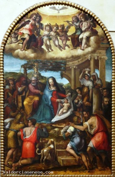 Il dipinto, iniziato dal Riccio e concluso da Arcangelo Salimbeni, si trovava sopra l’altare dedicato alla Natività di Gesù, mente oggi è appeso alla parete destra della chiesa. La scena rappresentata è quella dell’arrivo dei pastori a Betlemme dopo che l’Angelo ha annunciato loro la nascita del Salvatore Cristo Gesù. Nel dipinto il gesto della Madonna che alza il velo bianco pone in evidenza il corpo di Cristo. Nella parte alta dell'opera si scorge lo Spirito Santo che, sotto forma di colomba, scende sul Bambino, la cui nudità indica che Egli è vero uomo oltre che vero Dio. A fare da sfondo alla scena un edificio classico in rovina, simbolo del mondo antico romano che sta per finire, in contrasto con la vitalità del bambino Gesù che invece rappresenta il mondo cristiano che sta per nascere.