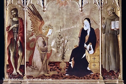 Gli interventi dei due pittori sono ormai identificati con un buon grado di certezza . Se Matteo di Giovanni dipinse i pannelli laterali raffiguranti i Santi Giovanni Battista e Bernardino e le cuspidi contenenti le figure di Pietro e Paolo , il resto sarebbe da attribuire a Giovanni di Pietro: così il pannello centrale con l' Annunciazione , che rimanda allo stile dell'autore della Madonna con Bambino e santi del Cleveland Museum of Art; la piccola Crocifissione della cuspide centrale; e l'intera predella che, purtroppo, è stata separata dall'insieme da una data anteriore alla prima metà del XIX secolo (vedi sotto, "Ricostruzione della pala").