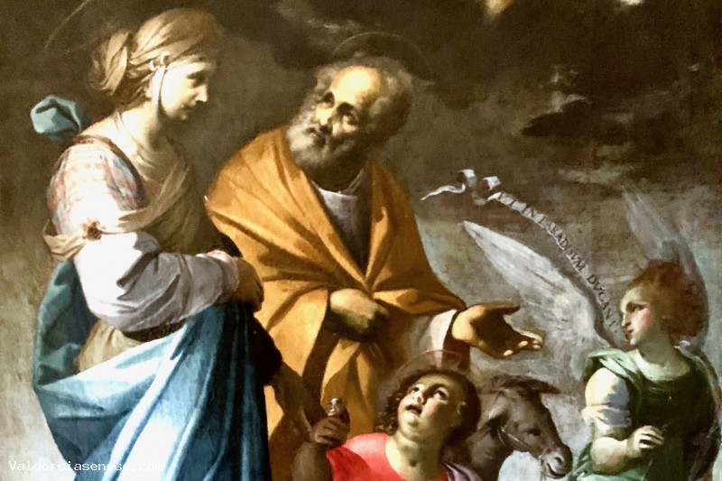 Il san Giuseppe esorta, con la sinistra, la Madonna a proseguire il viaggio, mentre in basso a destra un angelo conduce l'asinello tenendolo per una corda.