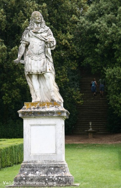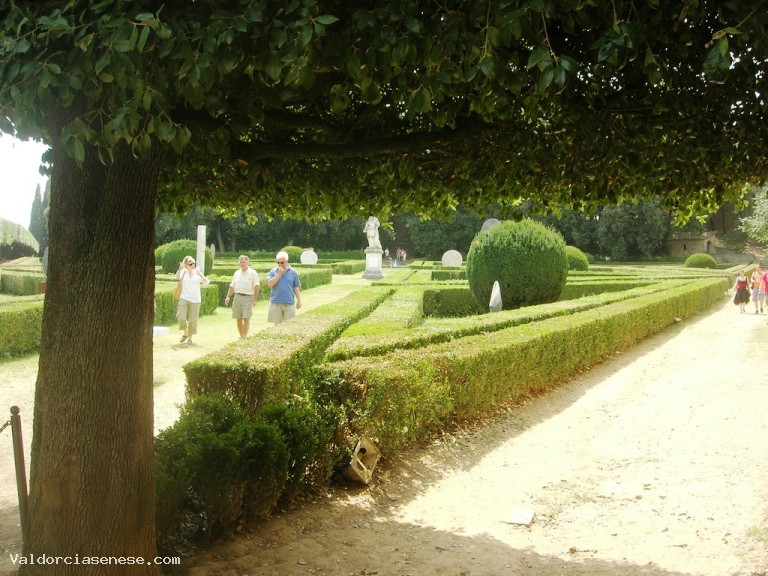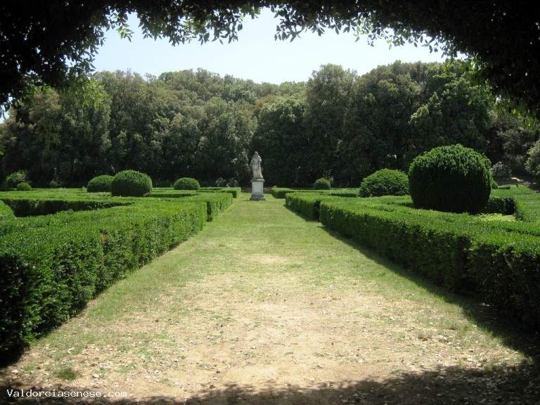 La conformazione del terreno ha influenzato la distribuzione del giardino che si divide in due zone, quella inferiore più artificiale, e quella superiore più naturale. La zona inferiore, a forma di rombo, al quale si accede tramite un piccolo cortile a mattoni, è recintata da muri e da lecci potati. Questa zona, composta da aiuole triangolari bordate da una doppia siepe di bosso, reca al centro la statua di Cosimo III de' Medici, scolpita da Bartolomeo Mazzuoli (1688).