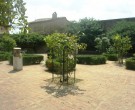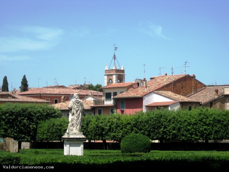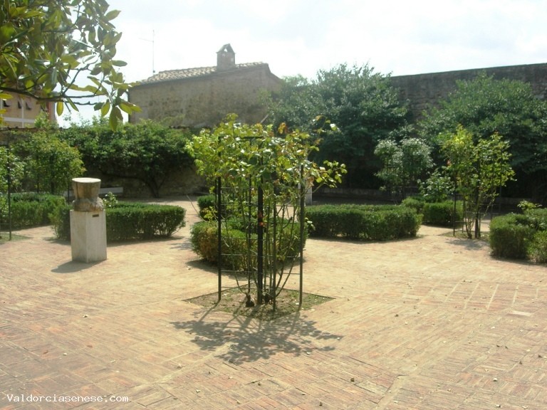 Nel piazzale vi era una torre medievale che fu distrutta durante l'ultima guerra mondiale, è posto al centro di un bosco di lecci secolari attraversato da sentieri tortuosi. Il viale di confine con l'abitato, che fiancheggia il giardino inferiore e la parte bassa del bosco, porta ad un altro ingresso cinquecentesco e ad una piccola area, nell'angolo est delle mura, piantata con cespugli di rose.