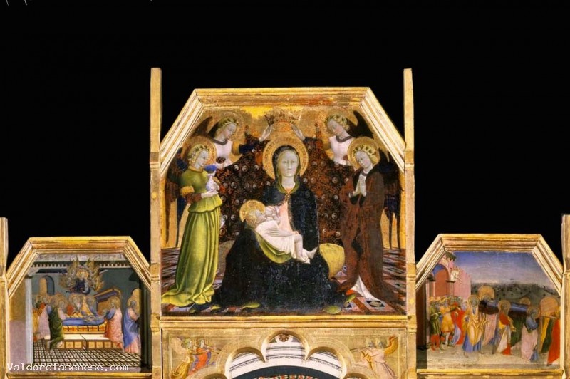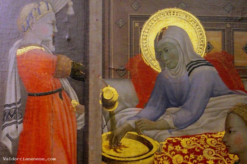 In questo polittico della “Natività della Vergine” è rappresentato un ambiente domestico della Siena di allora, con una buona dose di fantasia che rende la realtà quotidiana ancora più fiabesca. Una sorta di “Buon Governo” della famiglia, dove tutto è documentato dettagliatamente e sta esattamente al suo posto: ricchi, poveri, servi, infanti e visitanti.